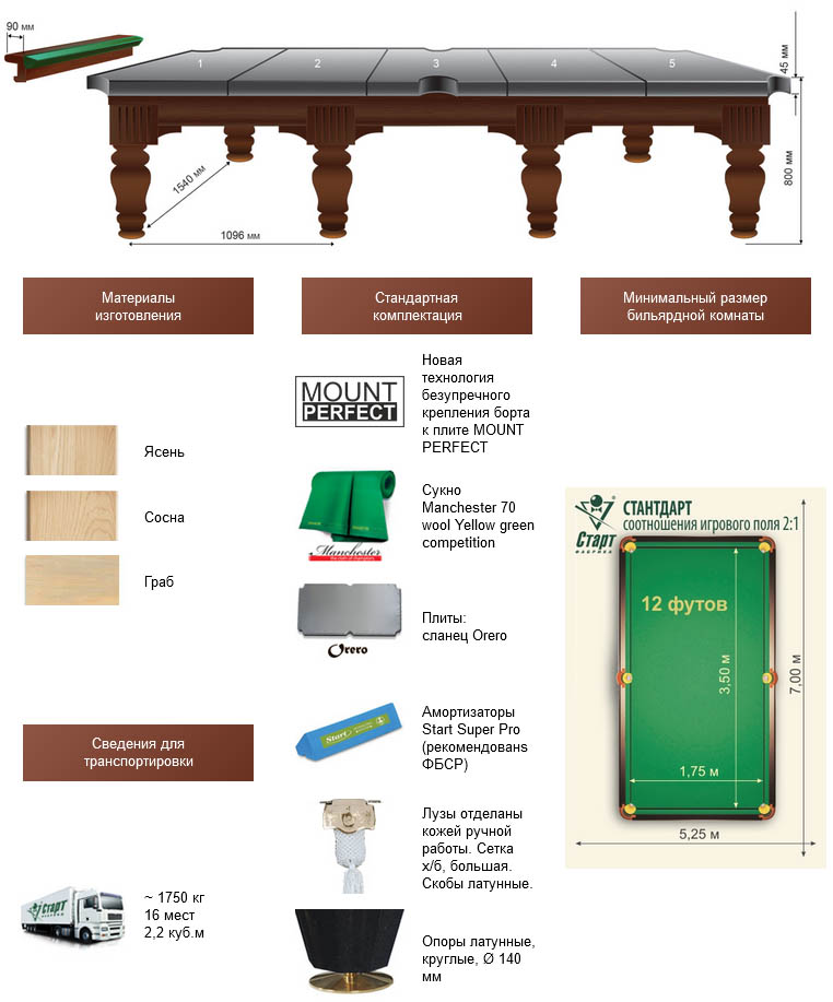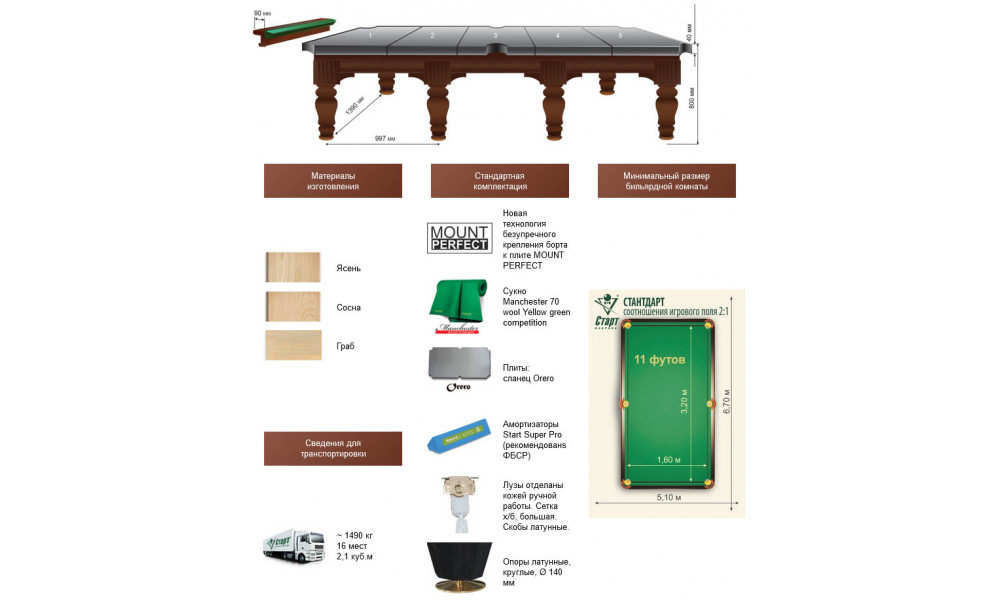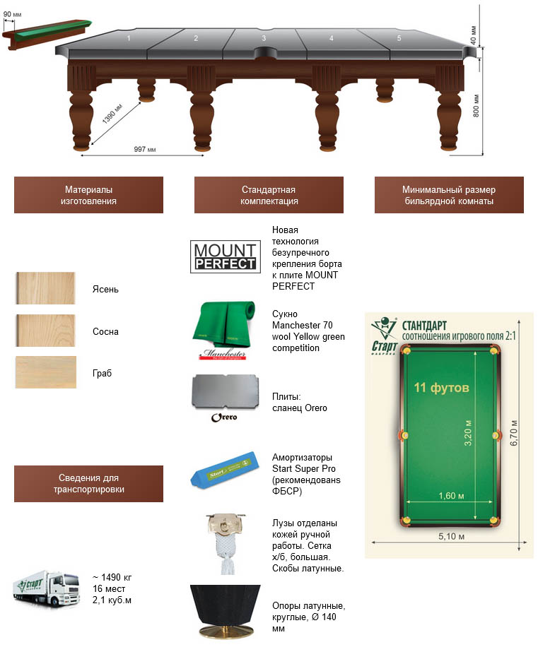 Стол выполнен из комбинации пород дерева: ясень/сосна/граб. В построении используется новая технология безупречного крепления борта к плите - Mount Perfect, которая гарантирует повышенную жесткость конструкции. Эффектные лузы отделаны кожей ручной работы с геральдическим тиснением.